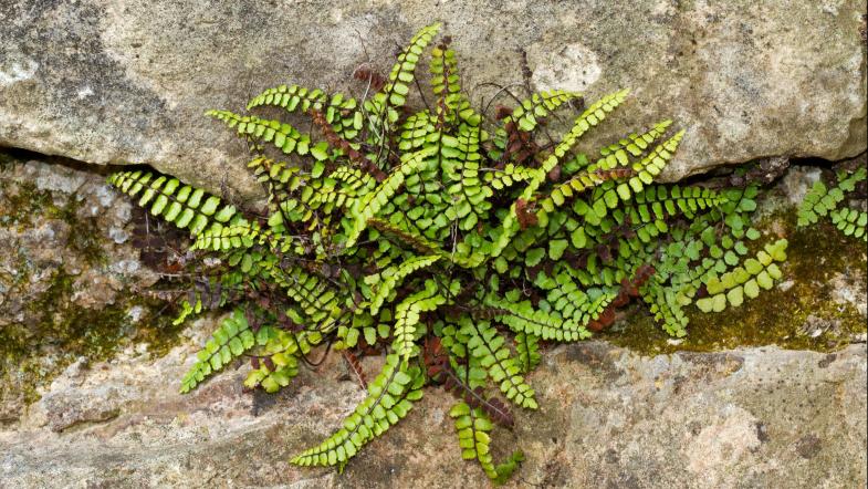 Braunstieliger Streifenfarn (Asplenium trichomanes): Wuchshöhe: 10 bis 20 cm; gut für schmale Mauerfugen geeignet; eher frischer Boden, halbschattiger bis schattiger Standort
