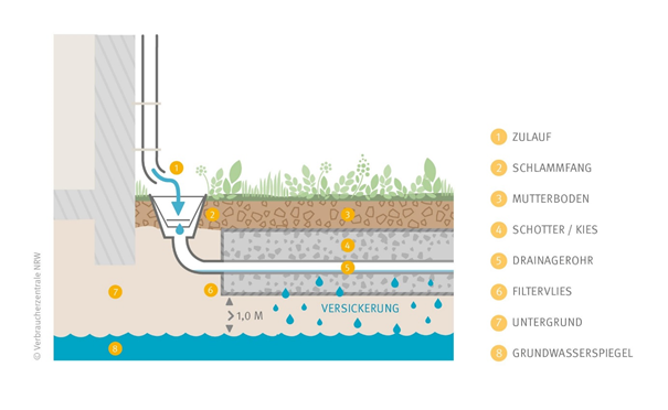 - Regenwasserversickerung entlastet die Kanalisation und schützt vor Überflutung bei Starkregen.